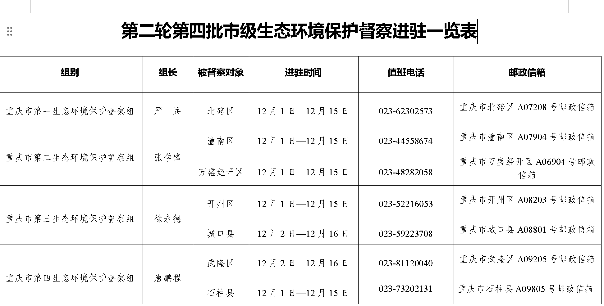 12月1日至2日,重庆市第一、第二、第三、第四生态环境保护督察组正式进驻北碚区、潼南区、万盛经开区、开州区、城口县、武隆区、石柱县,各区县分别组织召开了督察工作动员会,至此,重庆市第二轮第四批生态环境保护例行督察全部实现督察进驻。