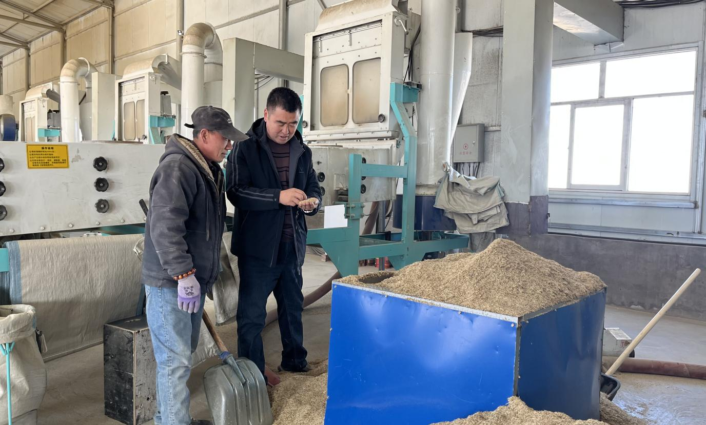 安志军(右)和工人查看草籽筛选情况(郭大蕾 摄)